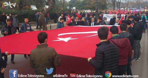Terörün protesto edildiği yürüyüşüne AK Parti İl Başkanlığı, MHP İl Başkanlığı, Türk ve Ülkü Ocakları, Baro Başkanlığı destek verirken, binlerce Edirneli de ellerinde Türk Bayraklarıyla teröre lanet yağdırdı. Şükrü Paşa İlkokulu önünden başlayan Talat Paşa Asfaltı boyunca devam eden yürüyüş, Atatürk Anıtı önünde sona erdi. Grup yol boyunca 'Vatan sana canım feda', 'Şehitler ölmez, vatan bölünmez', 'Ne mutlu Türk'üm diyene' sloganları attı. Anıt önünde terörü lanetleyen basın bildirisi okundu.
