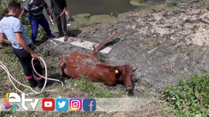 Sürüden ayrılan bir inek, derenin yanındaki bataklıkta çamura saplandı. Sürü sahibi Yurdalan Uzun ve yakınları ineği battığı yerden çıkaramayınca itfaiyeden yardım istedi.