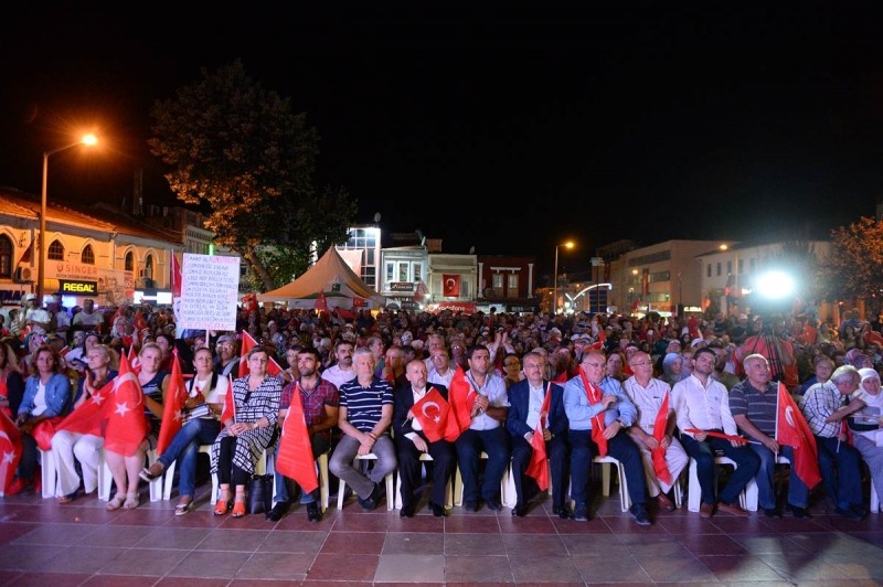 İhnaet çetesi ele başı Fetullah Gülen’in talimatı ile Türkiye Cumhuriyeti Devleti’nin yönetimini silah zoru ile ele geçirmek isteyen FETÖ’cülere karşı Cumhurbaşkanı Recep Tayyip Erdoğan’ın çağrısı ile başlayan demoktasi nöbetleri yine Başkomutan’ın çağrısı ile sona erdi.15 Temmuz gecesi yaşanan eli kanlı terör örgütü FETÖ mensubu askerlerin darbe girişiminden sonra Atatürk Meydanı’nda düzenlenen 'demokrasi nöbetleri' dün geceki programla tamamlandı.Son demokrasi nöbetine Edirne Valisi Günay Özdemir'in yanı sıra siyasi parti il başkanları ve ellerinde Türk bayraklarıyla yüzlerce Edirneli katıldı.Vatandaşlar Atatürk Anıtı önünde kurulan dev ekrandan, Başkomutan, Cumhurbaşkanı Recep Tayyip Erdoğan ile Başbakan Binali Yıldırım'ın Cumhurbaşkanlığı Külliyesi'ndeki konuşmasını canlı yayından izledi.