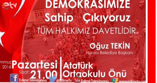15 Temmuz akşam yaşanan darbe girişimine karşı Demokrasimize sahip çıkan Havsa halkımızla, omuz omuza, tüm kamu kurum ve kuruluşlarımız, siyasi partilerimiz ve sivil toplum kuruluşlarımızla birlikte organize ettiğimiz,