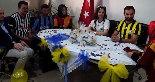 Genç çift, çalıştıkları gazetede düzenlenen nikâh törenine, alışılmışın dışında gelinlik ve damatlık yerine taraftarı oldukları Fenerbahçe'nin formasını giyerek geldi. Gelin ve damat, üstünde “Hilal 19” ve “Uğur 07” yazan sarı-lacivertli formalar giydi. Nikâh törenindeki sürpriz, bu kadarla sınırlı kalmadı. Gelin ile damadın şahitleri de taraftarları oldukları Beşiktaş, Galatasaray ve Trabzonspor'un formalarıyla törende yer aldı.