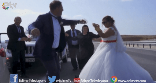 Edirne’den düğün için İstanbul’a doğru yola çıkan Trakyalı gelin ve damat ile konvoydakiler, karayolu kenarında durup müzik eşliğinde oynadı. Yoldan geçen sürücüler de korna çalarak çiftin mutluluğuna ortak oldu.