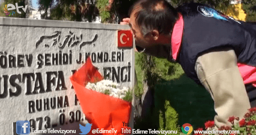 Bu sıra 57 yaşındaki engelli Cevat Akıncı, görev şehidi jandarma komando eri Mustafa Kalenci'nin mezar taşındaki Türk bayrağını öpmesi dikkat çekti.