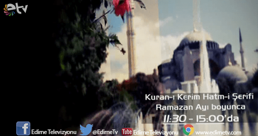 Edirne Televizyonu’nda her ramazanda olduğu gibi bu Ramazan ayında da Hatm-i Şerif yayınlanacak. İzleyicilerimizin ilgiyle takip ettiği Hatm-i Şerif programı, her gün 11.30 ve 15.00 saatlerinde yayınlanacak. Yarın saat 11.30’da başlayacak olan Hatm-i Şerif’in tekrarı ise 15.00’te yayınlanacak.