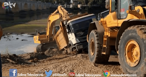 Meriç Nehri’nde devam eden Karaağaç Tahliye Kanalı Projesinde çalışan hafriyat kamyonu devrildi.