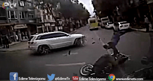 Edirne’de akşam saatlerinde bir cip, motosiklet ve halk otobüsünün karıştığı trafik kazasında 2 kişi yaralandı. Kaza anı ise güvenlik kameralarına işte böyle yansıdı.