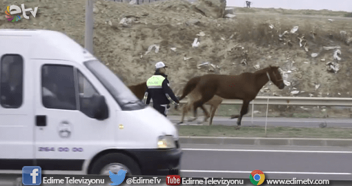 İhbar üzerine olay yerine polis ekipleri sevk edildi. Ekiplerin yarım saatlik uğraşı sonucu sahipsiz atların bariyerlerin dışına çıkarılmasıyla, trafik normale döndü.