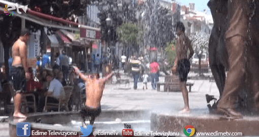 Edirne’de sıcaktan bunalan çocuklar tehlikeye aldırış etmeden süs havuzlarında serinlemeye çalıştı.