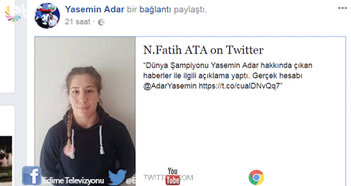 Dünya şampiyonu Yasemin Adar, Twitter’da kendisi adına açılan hesabın ve bu hesaptan atılan twitin gerçekliğinin olmadığını bildirdi.