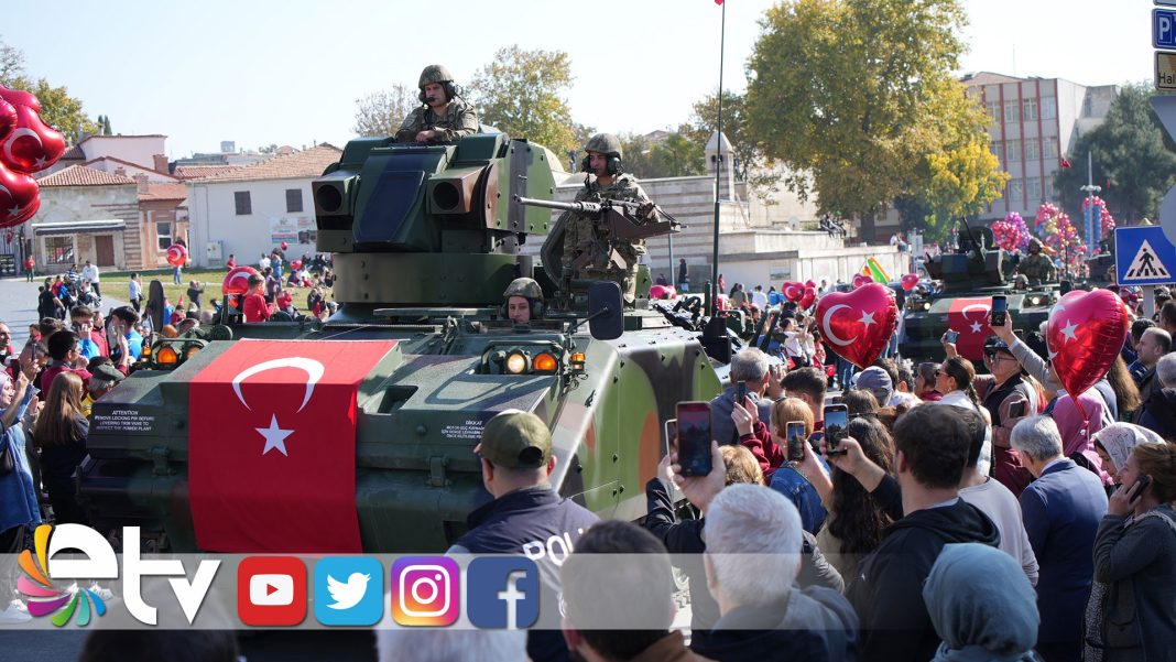 Cumhuriyetimizin ilan edilişinin 101’inci yıldönümü nedeniyle Edirne’de düzenlenen etkinliklerde büyük coşku yaşandı. Edirne Valisi Yunus Sezer’in makamında tebrikleri kabul etmesiyle başlayan kutlama programı, Talatpaşa Asfaltında düzenlenen törenle devam etti. Tören alanına gelen Edirne Valisi Yunus Sezer, Garnizon Komutanı Tuğgeneral Yüksel Kolcu ve Edirne Belediye Başkanı Av. Filiz Gencan Akın, tören aracına binerek vatandaşların bayramını kutladı.