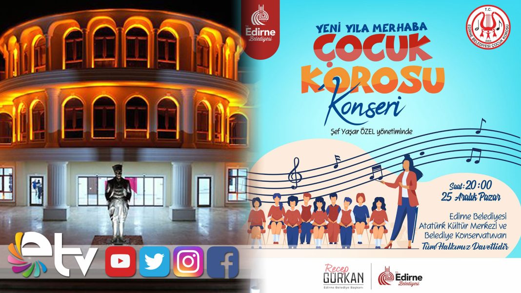 Edirne Belediyesi Çocuk Korosu tarafından düzenlenecek olan “Yeni Yıla Merhaba” Konseri 25 Aralık 2022 Pazar Günü Saat 20.00’de Edirne Belediyesi Atatürk Kültür Merkezi ve Belediye Konservatuvarı’nda gerçekleştirilecek.
