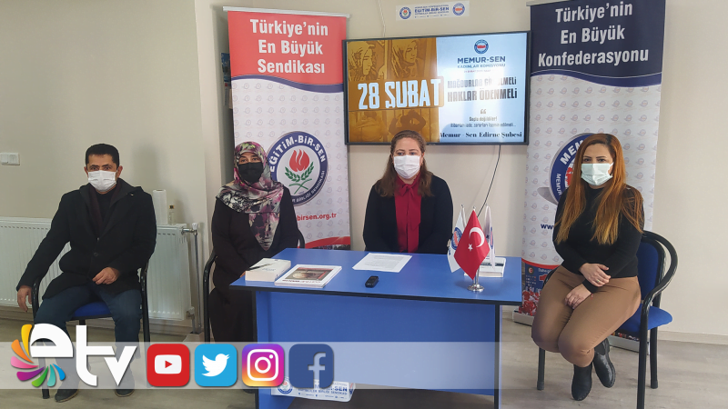 Edirne Memur Sen Kadınlar Komisyonu, Eğitim Bir Sen Edirne Şube binasında 28 Şubat süreciyle ilgili basın açıklaması yaptı. Memur Sen ve Eğitim Bir Sen Kadın Komisyonu Başkanı Yeliz Yanar okuduğu basın açıklamasında,”Milletin iradesinin ve egemenliğinin, çoğunluğu kadın olmak üzere kamu görevlilerinin emeğinin, ekmeğinin, hak ve özgürlüğünün gasp edildiği 28 Şubat darbesi” olarak değerlendirdi ve bu süreçte mağdur olanlara yönelik talepleri dile getirdi.