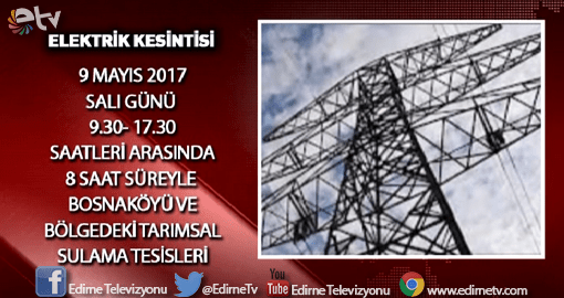 9 Mayıs 2017 Salı günü 9.30- 17.30 saatleri arasında 8 saat süreyle Bosnaköyü ve bölgedeki tarımsal sulama tesislerine elektrik verilemeyecek.