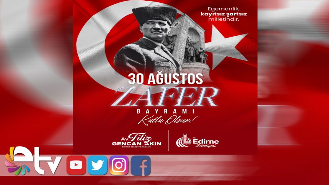 30 Ağustos Zafer Bayramı’nın 103’üncü yıldönümü nedeniyle bir mesaj yayınlayan Edirne Belediye Başkanı Av. Filiz Gencan Akın, “30 Ağustos ruhu bizlere; asla umutsuzluğa kapılmamayı, şartlar ne olursa olsun mücadele etmeyi ve en önemlisi egemenliğin kayıtsız şartsız millete ait olduğunu hatırlatır. Yaşasın 30 Ağustos, yaşasın Cumhuriyet, yaşasın Büyük Atatürk!” ifadelerini kullandı.