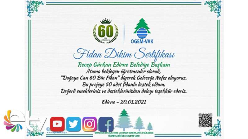 Edirne Belediye Başkanı Recep Gürkan, Mili Eğitim Bakanlığı’ndan atama bekleyen öğretmenlerin sosyal medya üzerinden başlattığı 60 Bin Fidan Kampanyası’na 50 adet fidan bağışlayarak, destekte bulundu.