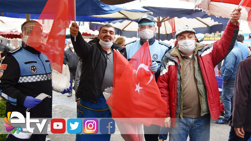 Kamuya açık yerlerde maske dağıtımına devam eden Büyükşehir Belediyesi Zabıta Ekipleri vatandaşlara Türk Bayrağı da hediye ediyor. Türk Bayrağınıve maskelerini alan pazarcı esnafı ve pazara gelen vatandaşların memnuniyetlerini coşkulu şekilde belli ederek şimdiden bayram heyecanını yaşamaya başladılar.