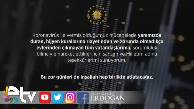 “Bildiğiniz gibi ülkemiz, tüm dünyayı etkisi altına alan koronavirüs ile amansız bir mücadele veriyor. Virüsün ülkemizde vatandaşlarımız arasında bulaşıcı etkisinin en az seviyede tutulması için gece gündüz çalışıyoruz. Virüs, en fazla yaşlı ve kronik hastalığı olan vatandaşlarımıza bulaşıyor, en çok bu iki grubun ölümüne sebep oluyor. Bu bilgiyi aklınızdan hiçbir zaman çıkarmadan, kendinize ve etrafınızdaki yaşlı ya da kronik hastalık taşıyan yakınlarınıza dikkat etmenizi istirham ediyorum. Bunu için öncelikle hijyen kurallarına kat-i suretle riayet etmeli, sosyal mesafeyi olabildiğince artırmalı ve en önemlisi zorunda olmadıkça kesinlikle evden dışarı çıkmamalısınız. Bu süreçte, başta Sağlık Bakanlığımız olmak üzere resmi kurum ve kuruluşlarımızın açıklamalarını dikkatle takip etmelisiniz. Kamu hizmetlerinde, alışverişte, yakınlarımızla iletişimde ve daha birçok aktivitede internet teknolojisini ve telekomünikasyon imkanlarını kullanmaya, ibadetlerimizi evlerimizde eda etmeye, mümkün olduğunca ziyaretçi kabul etmemeye ve vaktimizi evlerimizde geçirmeye özen gösterelim. Koronavirüs ile vermiş olduğumuz bu mücadelede yanımızda duran ve sorumluluk bilinciyle hareket eden tüm vatandaşlarıma şahsım ve milletim adına teşekkürlerimi sunuyorum. Bu zor günleri de inşallah hep birlikte atlatacağız. Kalın sağlıcakla.”