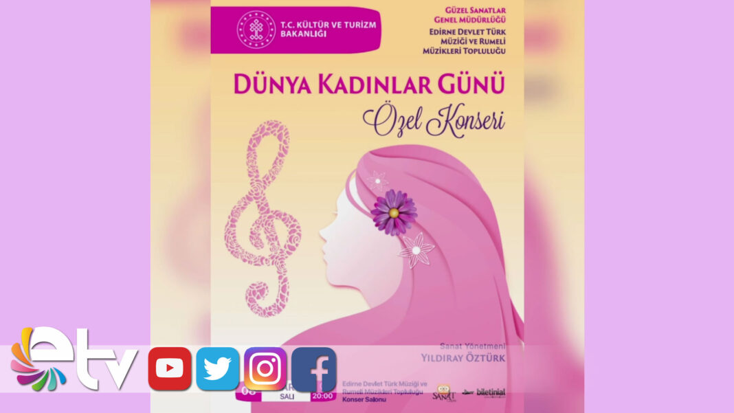 Kültür ve Turizm Bakanlığı Güzel Sanatlar Genel Müdürlüğü Edirne Devlet Türk Müziği ve Rumeli Müzikleri Topluluğu tarafından 8 Mart Dünya Kadınlar günü nedeniyle konser düzenlenecek. 8 Mart Salı günü saat 20.00’de topluluk konser salonunda gerçekleştirilecek konserde; kadınlara ithafen yazılmış şarkılar ve kadın bestekarlara ait eserler seslendirilecek.