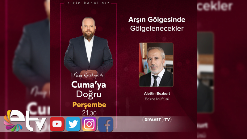 Diyanet TV’de her hafta Perşembe günü akşamı saat 21.30'da yayına giren ve Necip Karakaya’nın sunuculuğunu yaptığı 'Cuma’ya Doğru' programının bu akşamki konuğu Edirne İl Müftüsü Alettin Bozkurt olacak. Programda bu hafta 'Arşın Gölgesinde Gölgelenecekler' konusu, Müftü Alettin Bozkurt'la konuşulacak. Dini konuların konuşulup ele alındığı, ilahilerin söylendiği Cuma’ya Doğru programı bu akşam saat 21.30'da başlayacak.