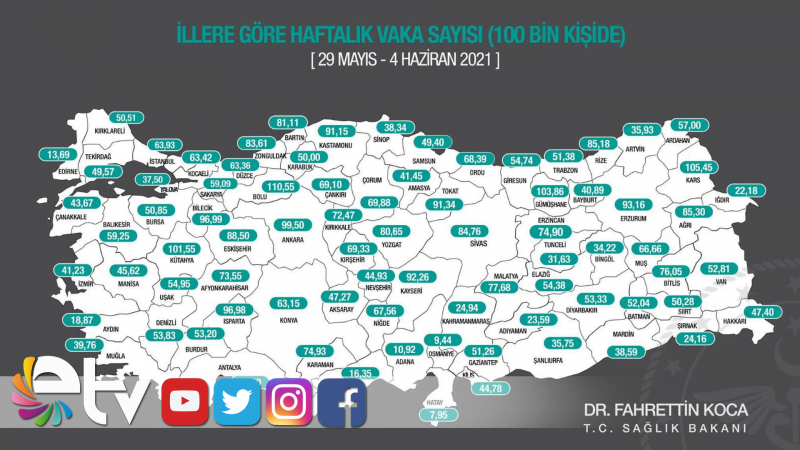 Sağlık Bakanlığı’nın bu haftaki vaka haritası, illerdeki vaka oranlarında ciddi düşüşlerin olduğunu ortaya koydu. Bakanlığın 29 Mayıs -4 Haziran 2021 tarihleri arasını kapsayan illere göre haftalık vaka oranı haritasında Edirne yüz bin kişide 13,69, Kırklareli 50,51, Tekirdağ ise yüz binde 49,57 olarak gerçekleşti.