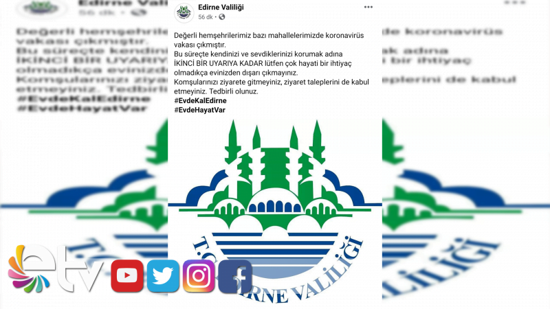 Edirne Valiliği tarafından Edirne’de bazı mahallelerde Koronavirüs vakaları görüldüğü ifade edilerek vatandaşlardan ikinci bir uyarıya kadar hayati bir ihtiyaç olmadıkça sokağa çıkmamaları, misafir kabul etmemeleri istendi.