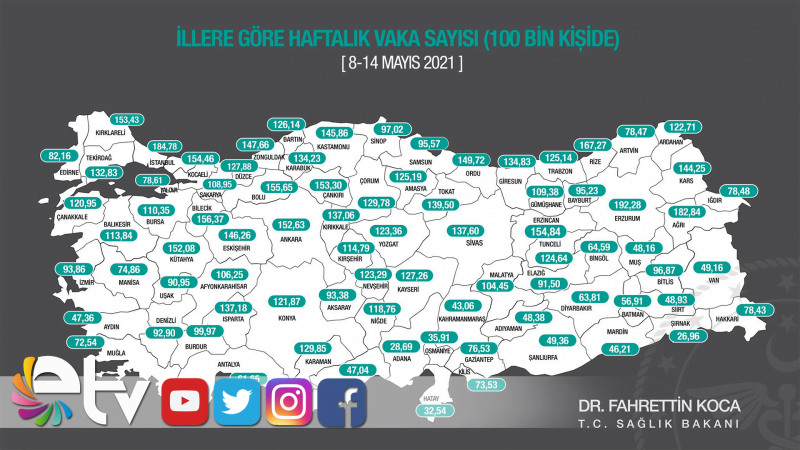 Bakan Koca’nın paylaştığı haritaya göre Edirne’de vaka sayısı 100 binde 82,16 olarak gerçekleşirken, Tekirdağ 132,83 ve Kırklareli 153, 43 ile çok yüksek riskli iller arasında yer almaya devam ediyor.