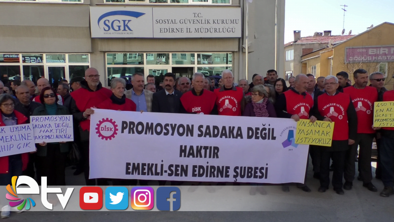 DİSK’e bağlı Emekli Sen Edirne Şubesi tarafından SGK İl Müdürlüğü önünde ‘Promosyon, Sadaka değil haktır’ basın açıklaması gerçekleştirildi.