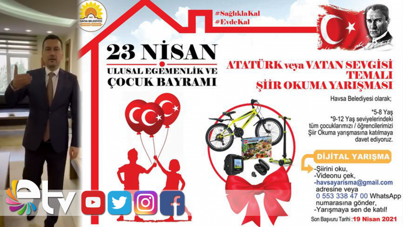 Havsa Belediyesi, 23 Nisan Ulusal Egemenlik ve Çocuk Bayramı etkinlikleri kapsamında 5-8 yaş ve 9-12 yaş aralığındaki tüm çocuklar için bir yarışma düzenleyecek.Yarışmaya katılacak olan çocukların Atatürk veya Vatan Sevgisi temalı istedikleri bir şiirin en çok 2 kıtasını okuyup, video kaydını çekip açıklanan mail adresine ya da telefon numarasına iletmesi gerekiyor.
