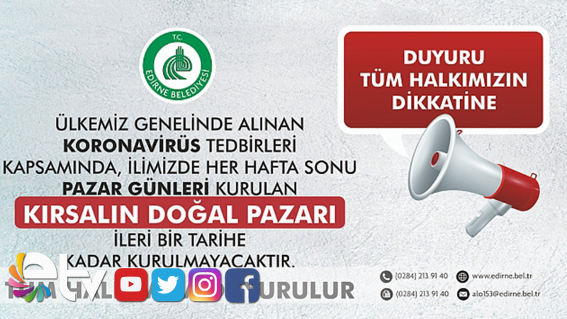 Edirne Belediyesi, Koronavirüsü riski ortadan kalkana kadar aldığı tedbirlere yenilerini ekledi. Edirne Belediyesi yaptığı açıklama ile kentte her Pazar kurulan ve köy kadınlarının kendi el ürünlerini sattığı Kırsalın Doğal Pazarı’nın, Edirne Belediyesi Kent Müzesi, Belediye Binası’nda bulunan Atatürk Odası’nın ve Hasan Ali Yücel Çocuk Eğitim Yerleşkesi’ nin ikinci bir duyuruya kadar kapatıldığını Edirne Belediyesi Yaşam Merkezi’ndeki atölye çalışmalarına da iki hafta boyunca ara verildiğini açıkladı.