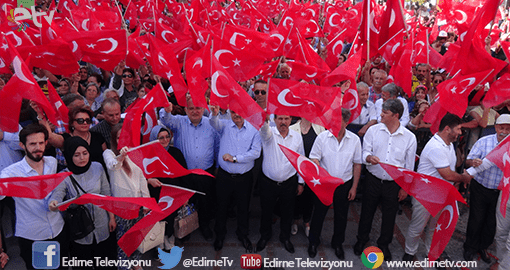 Darbe girişiminin ardından başlayan demokrasi nöbetleri, İstanbul Yenikapı Meydanı’ndaki buluşma ile taçlanıyor. Demokrasi ve Şehitler Mitingi, 80 ilde kurulan dev ekranlardan yayınlandı. Edirneliler de ellerinde Türk bayraklarıyla mitingi izlemek için dev ekranın kurulduğu Saraçlar Caddesi’ne akın etti.