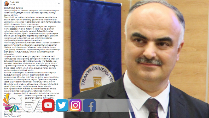 Trakya Üniversitesi Rektörlüğü, İlahiyat Fakültesi Dekanı Prof. Dr. Cevdet Kılıç’ın Boğaziçi Üniversitesi’ndeki eylemlere ilişkin sosyal medya üzerinden yaptığı paylaşıma ilişkin soruşturma başlattı. Kılıç, sosyal medya hesabı üzerinden yaptığı açıklamada, sözlerinin kasıtlı olarak farklı yerlere çekildiğini belirterek, “Sözlerimizin muhatabı öğrenciler değildir. Öğrencilerimize yönelik şiddeti çağrıştıracak bir söylem asla söz konusu olamaz” dedi.