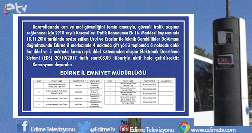 Karayollarında can ve mal güvenliğini temin amacıyla, güvenli trafik akışının sağlanması için 2918 sayılı Karayolları Trafik Kanununun ek 16. Maddesi kapsamında 18.11.2016 tarihinde revize edilen Usul ve Esaslar ile Teknik Gereklilikler Dökümanı doğrultusunda Edirne İl Merkezinde 4 noktada çift yönlü toplamda 8 noktada anlık hız ihlal ve 5 noktada kırmızı ışık ihlal sisteminden oluşan Elektronik Denetleme Sistemi (EDS) 20/10/2017 tarih saat: 08.00 itibariyle aktif hale getirilecektir” deniliyor.