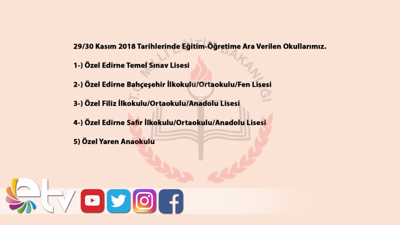 Edirne Milli Eğitim Müdürülüğünün resmi web adresinden yayınlanan duyuruda şunlara yer verildi “İlimiz Merkez İlçede 27/11/2018 Salı günü akşam saatlerinde başlayarak sabah saatlerine kadar devam eden yoğun sağanak yağmur yağışlarından dolayı, ulaşımlarında ve okul binalarında sorun yaşanan Duyuru da adı okullarımızda eğitim öğretime belirtilen tarihlerde ara verilmiştir.”