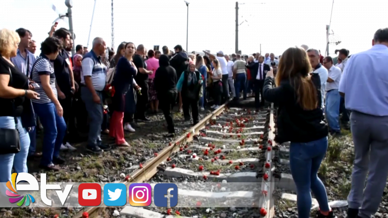 Konuşmanın ardından, olayın yaşandığı hem zemin geçide yürüyen grup, burada raylara karanfil bıraktı.