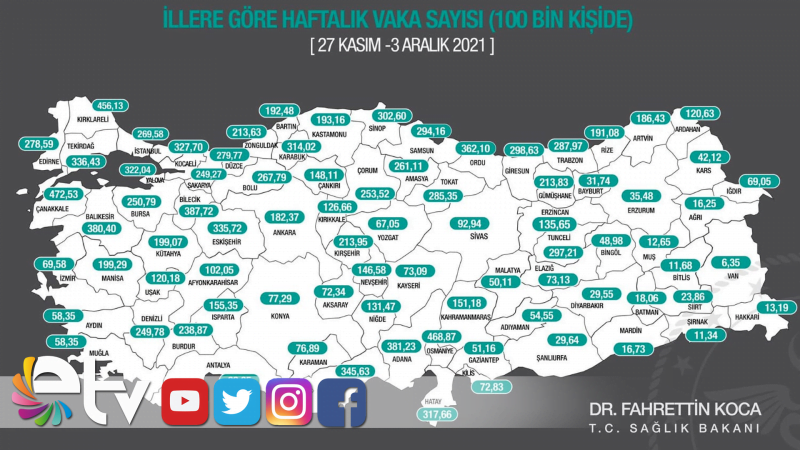 Sağlık Bakanı Fahrettin Koca’nın açıkladığı 27 Kasım- 3 Aralık tarihleri arasında İllere göre 100 bin kişide haftalık vaka sayısı haritasında Trakya bölgesinde vaka oranlarında büyük artış olduğu gözlendi.
