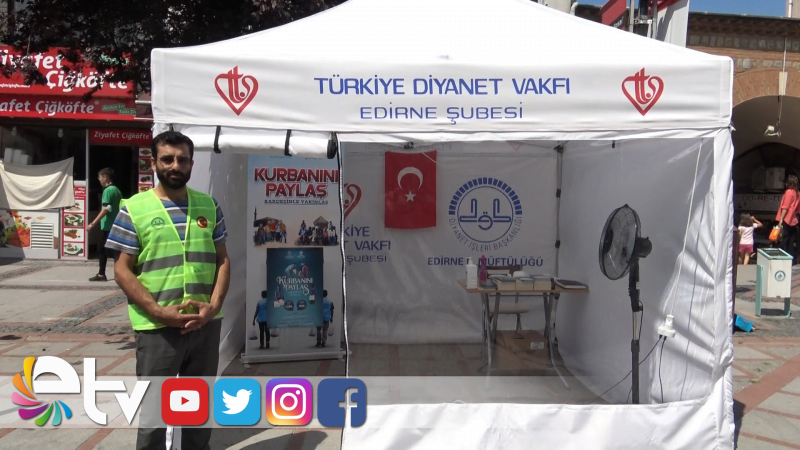 Türkiye Diyanet Vakfı Edirne Şubesi ve İl Müftülüğü tarafından ‘Kurbanını Paylaş, Kardeşinle Yakınlaş’ sloganıyla Saraçlar Caddesi’nde kurban bağış çadırı kuruldu.