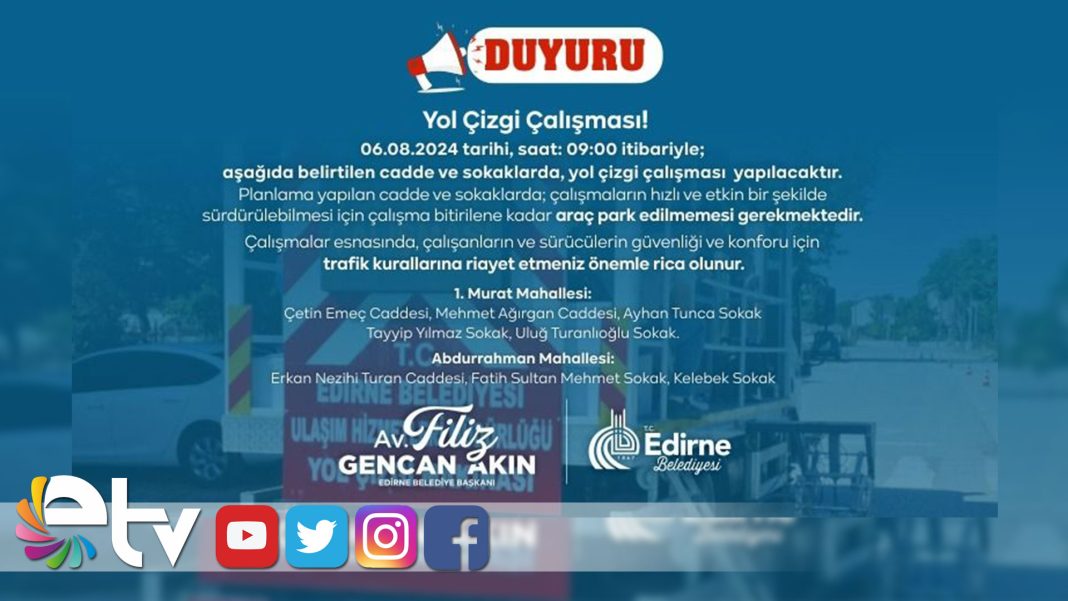 Edirne Belediyesi Ulaşım Hizmetleri Müdürlüğü, 6 Ağustos Salı günü itibariyle çeşitli cadde ve sokaklarda yol çizgi çalışması yapılacağını duyurdu. Trafik güvenliğini arttırmak amacıyla gerçekleştirilecek bu çalışma kapsamında, vatandaşların belirtilen alanlara araç park etmemeleri gerektiğini bildirdi.