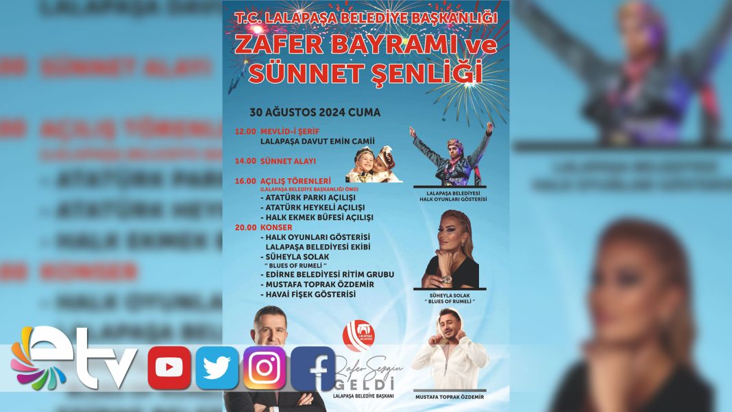 Geldi, “Önümüzdeki hafta 30 Ağustos Zafer Bayramı’nı kutlayacağız. Göreve gelmeden önce milli bayramlarımızı ilçemizde coşkuyla kutlayacağımıza dair hemşehrilerimize söz vermiştik. Şimdi bu sözümüzü yerine getirmenin onurunu yaşıyoruz. 30 Ağustos’ta gerçekleştireceğimiz Zafer Bayramı kutlamaları ve sünnet şenliğine tüm hemşehrilerimizi davet ediyorum. Saat 12.00’de Davut Emin Camii’nde mevlid-i şerifimizi, saat 14.00’te de tüm vatandaşlarımızın katılacağı sünnet alayını gerçekleştireceğiz. Daha sonra saat 16.00’da Lalapaşa Belediyesi Hizmet Binası önünde toplanarak Atatürk Parkı, Atatürk Heykeli ve Halk Ekmek Büfesinin açılışını yapacağız. Saat 20.00’da ise Lalapaşa Belediyesi Düğün Salonu önünde toplanarak, halk oyunları ekibinin ve Edirne Belediyesi Ritim Grubu’nun gösterilerini izleyeceğiz. Ardından Süheyla Solak ve Mustafa Toprak Özdemir birbirinden güzel şarkılarıyla kulaklarımızın pasını silecek. Coşkunun ve eğlencenin tavan yapacağı bir program hazırladık. Programımızda hemşehrilerimizi aramızda görmekten büyük mutluluk duyarız.” dedi.