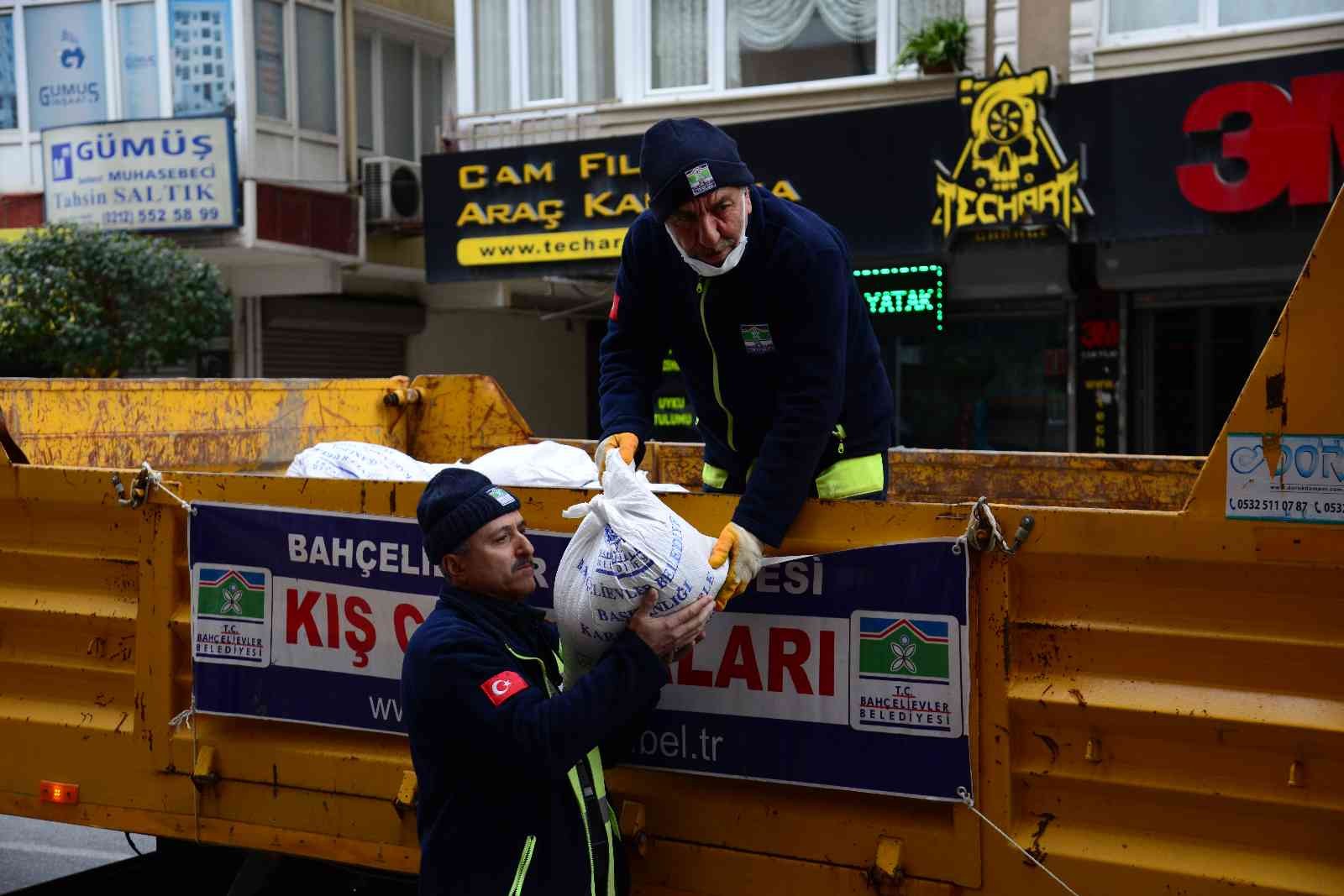 Esnaflara buzlanmalarda dükkânları önünde kullanmaları için hazırlanan tuz çuvalı dağıtılıyor.