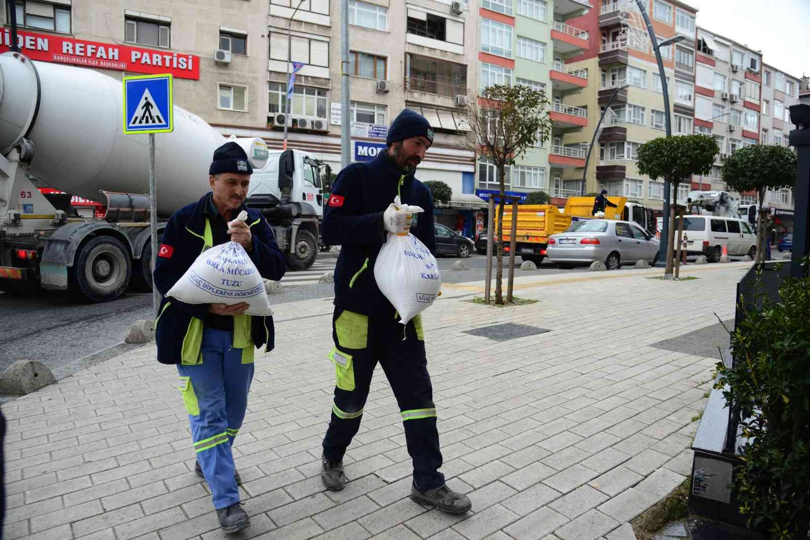 Çalışmalar kapsamında işletmelerin önünde kullanılmak üzere tuz çuvalları dağıtılmaya başlandı, sağlık ve güvenlikle ilgili kurumlar ile yol ve kaldırımlardaki çalışmaları yoğunlaştırılacak ve sokak hayvanları için mama desteği de sağlanacak.