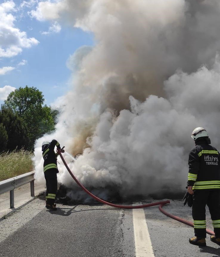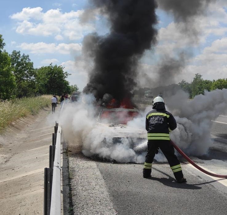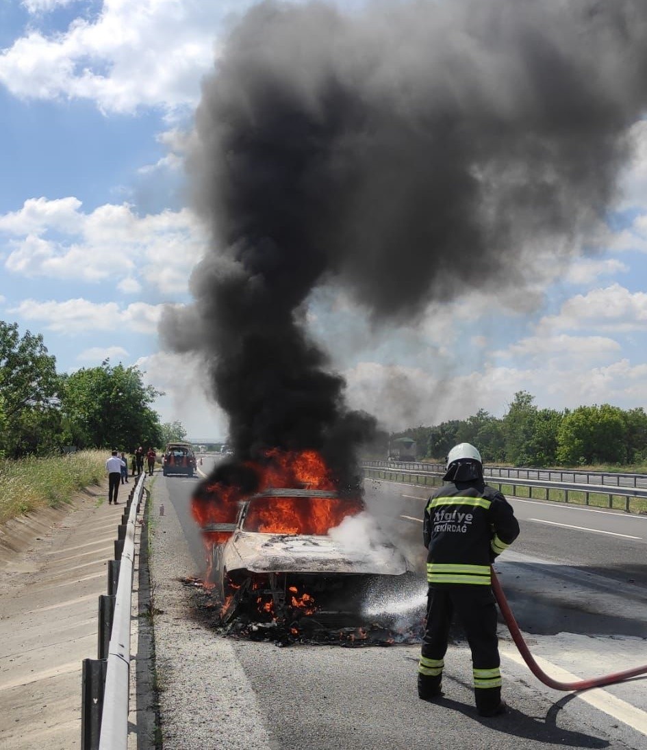 Tekirdağ’ın Ergene ilçesinde otobanda seyir halindeyken alev alan otomobil küle döndü.