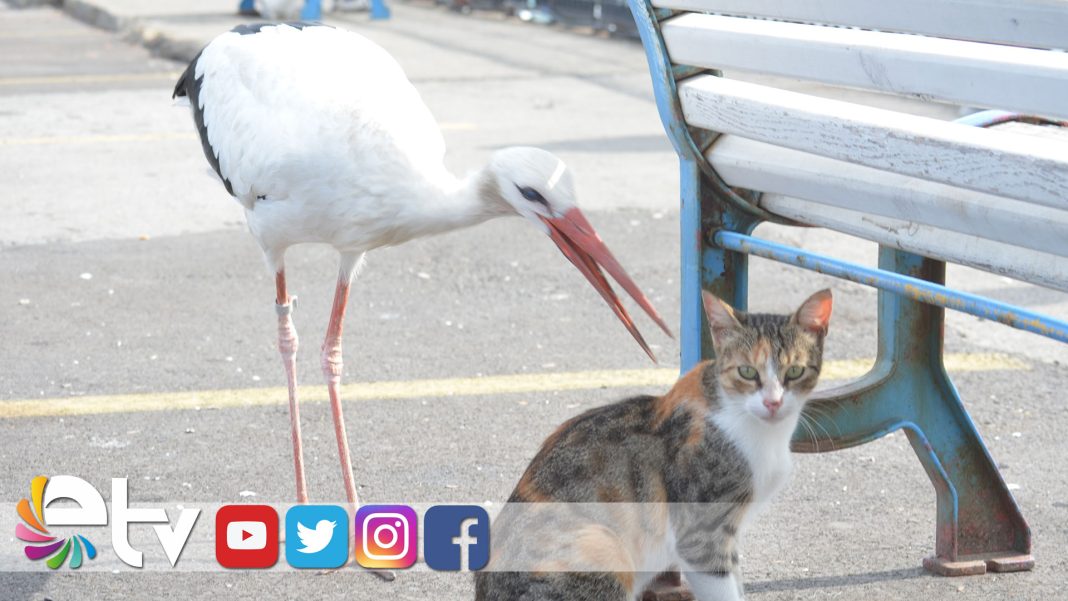 Geçen yıl sürüsünden ayrılarak Tekirdağ’ın sokaklarında yaşamaya başlayan leylek, sahilde balık çalmaya çalışırken kısmetine ortak olan kedileri gagaladı. O anları gören vatandaşlar, leyleği sakinleştirmeye çalışsa da inatçı leylek kedileri saklandıkları yerde gagalamaya devam etti.