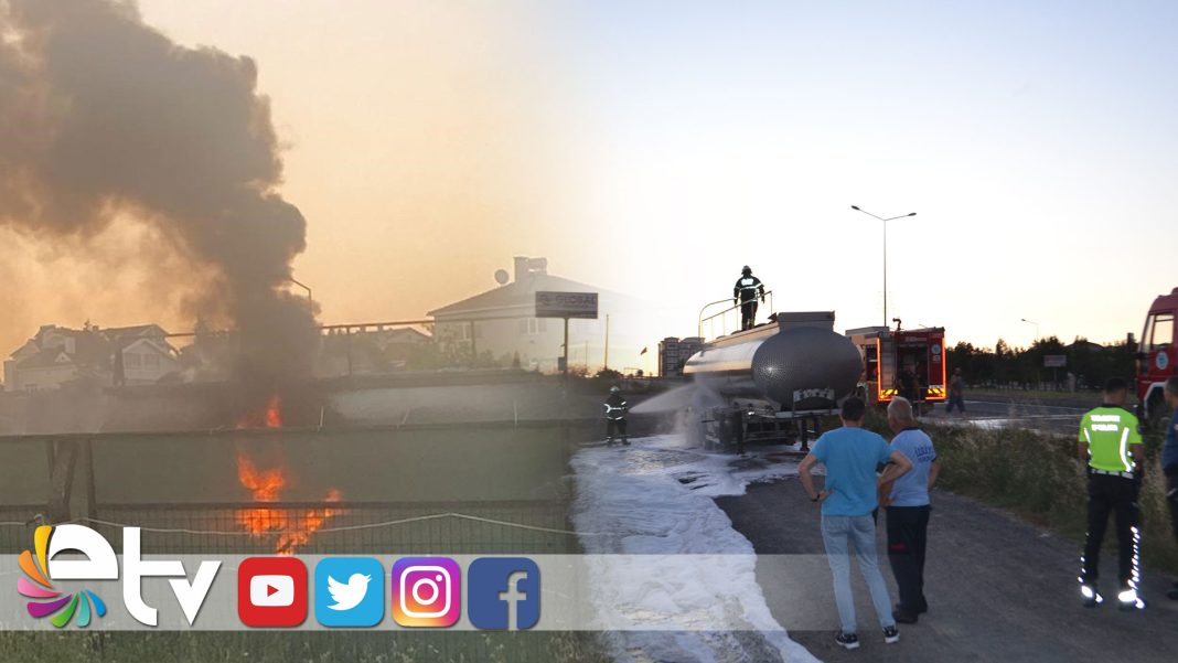 Tekirdağ’ın Ergene ilçesinde seyir halindeyken lastiği patlayan yağ tankerinde yangın çıktı.