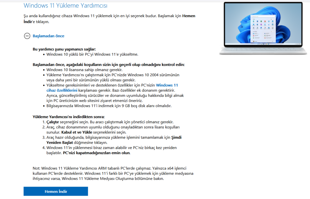 İlk olarak https://www.microsoft.com/tr-tr/software-download/windows11 adresine tıklayarak Windows 11 Yükleme Yardımcısı bölümünden hemen indire tıklayın.