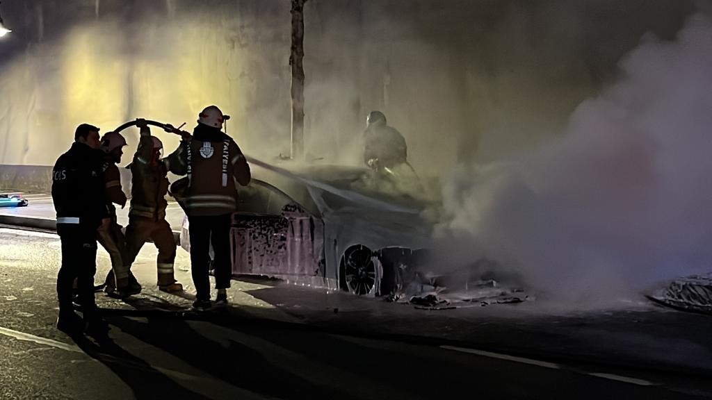 Lüks otomobilinin yandığını gören sürücü göz yaşlarına boğuldu