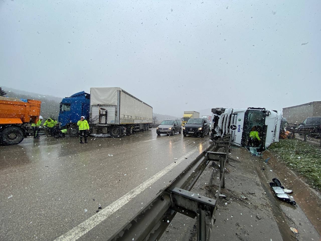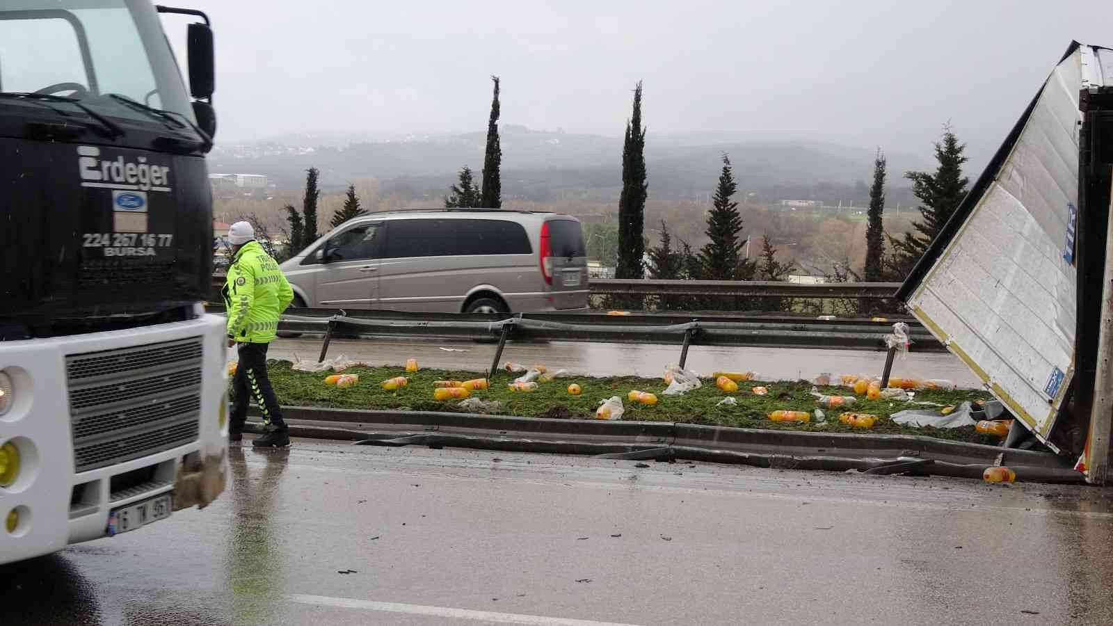 Bursa’da kar yağışı nedeniyle kontrolden çıkan tır bariyerlere çarparak devrildi. Arkasından seyreden tır da duramayarak bariyerlere çarptı. Devrilen tırın sürücüsü yaralanırken, dorsedeki içecekler yola saçıldı.