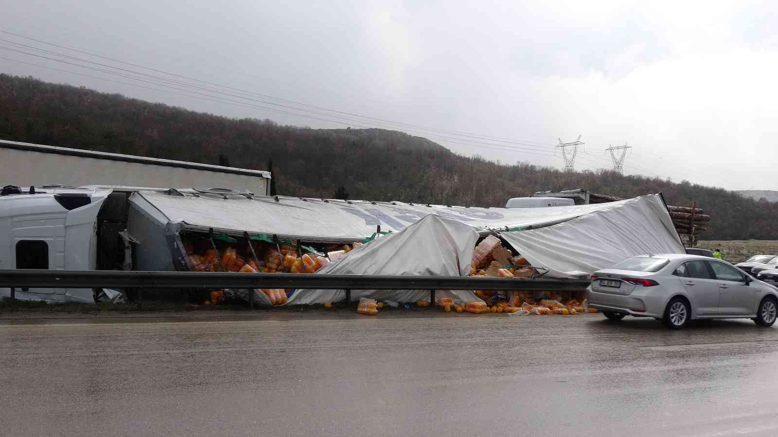 Edinilen bilgiye göre, Y.Y idaresindeki 06 CTT 157 plakalı içecek yüklü tır, kar yağışı sebebiyle kontrolden çıkarak bariyerlere çarptıktan sonra devrildi.