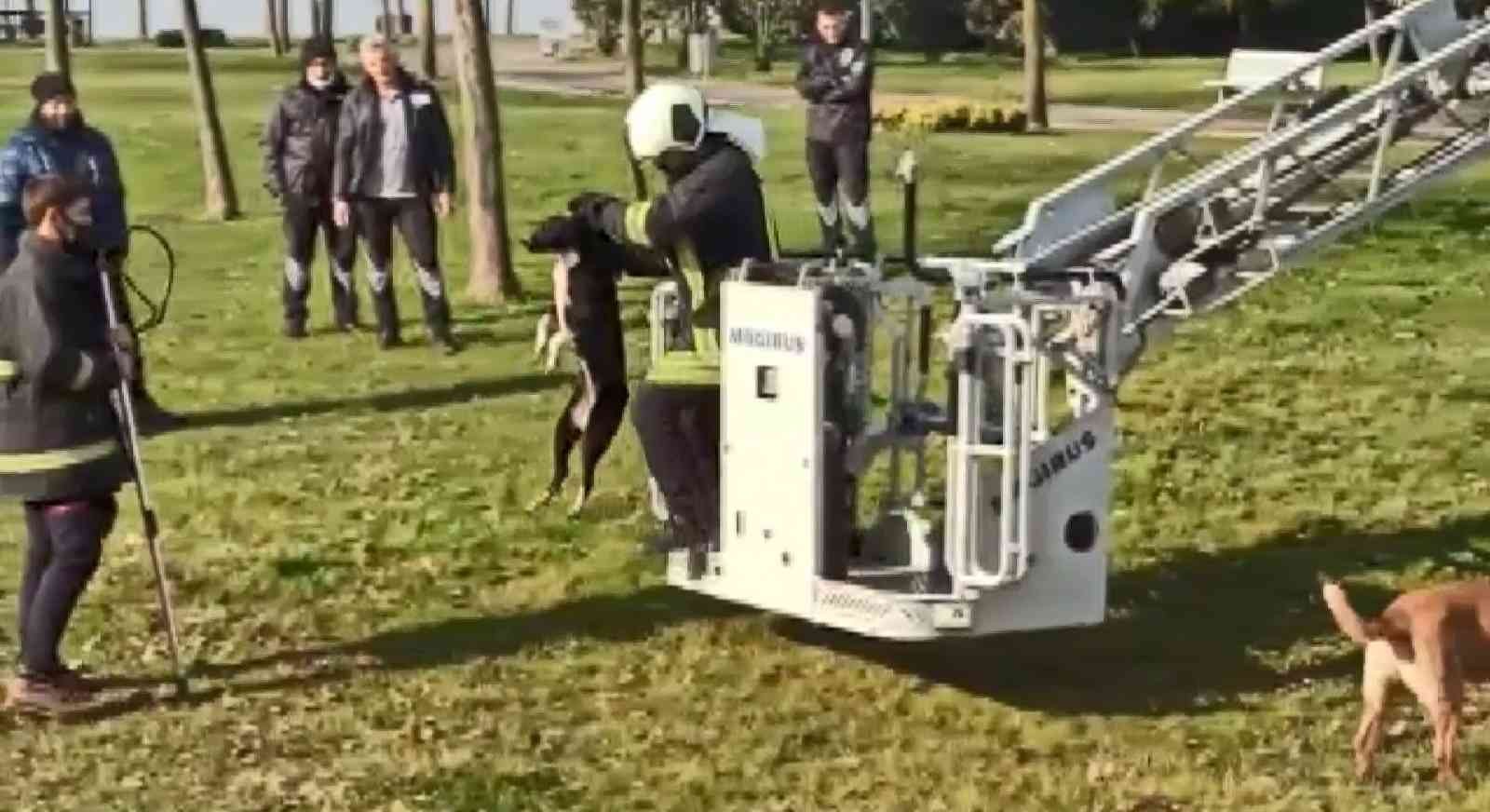 Kısa sürede olay yerine gelen itfaiye ekipleri, merdivenli araç yardımıyla köpeği sepete alarak, mahsur kaldığı yerden kurtardı.