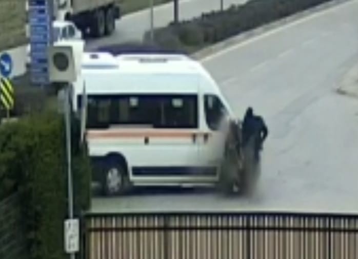 Bursa’nın İnegöl ilçesinde meydana gelen kazada servis minibüsü ile çarpışan motosikletin sürücüsü yaralandı. Kaza anı bir iş yeri güvenlik kameralarına saniye saniye yansıdı.