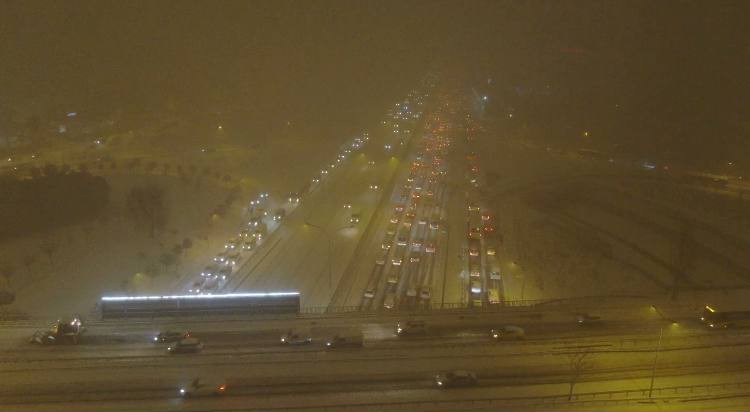 İstanbul Anadolu Yakası’nda etkisini artıran kar yağışı nedeniyle trafik durma noktasına gelirken, E-5 karayolunda mahsur kalan araçlar dron ile havadan görüntülendi.